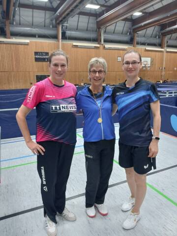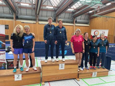 Eine wahre Medaillenflut gab es bei den Baden-Württembergischen Meisterschaften der Senioren und Seniorinnen in Laupheim. Mathias Ndhlovu schrammte bei den Senioren 45 an diesen Medaillen nach starken Spielen und drei Viertelfinal-Teilnahmen im Einzel, Doppel mit Björn Rogulka (TSV Dörzbach) und Mixed mit Ines Marquardt (TSV Burgstetten) noch knapp vorbei. Ingrid Reiner sicherte sich einen kompletten Medaillensatz mit Gold im Einzel bei den Seniorinnen 60, Silber im Doppel bei den Seniorinnen 50 mit Susanne Stösser (TTC Forchheim) und Bronze im Mixed mit Detlef Stickel (TTC Tuttlingen). Alexandra Schankula steht nicht so auf verschiedene Farben und holte sich deshalb bei den Seniorinnen 40 direkt drei goldene Exemplare in allen Kategorien. Dabei wurde sie ihrer Favoritenrolle mehr als gerecht und siegte im Einzel, im Doppel mit Natalie Weichel und im Mixed mit Frank Elseberg (SSV Ulm) ohne jeglichen Satzverlust. Natalie selbst spielte ebenfalls herausragend und wurde zusätzlich zum Doppel-Erfolg sowohl im Einzel, wo sie nur gegen Alex unterlag, als auch im Mixed an der Seite von Markus Brodbeck Vizemeisterin. Ebenso am Start und natürlich auch auf dem Podium war unsere langjährige Trainingspartnerin Simone Nagel, die bei den Seniorinnen 45 im Doppel mit Ines Marquardt den dritten Platz erreichte und anschließend im Einzel-Halbfinale knapp gegen ihre Doppelpartnerin gewann, um sich in einem abschließenden Endspiel-Krimi den Einzeltitel zu sichern.