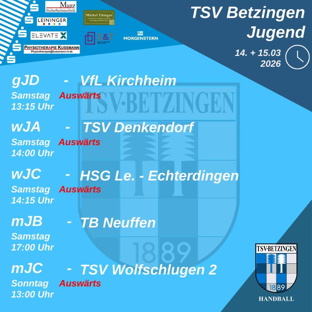 An diesem Wochenende (14./15. März 2026) ist beim TSV Betzingen ordentlich was los – sowohl auswärts als auch in der heimischen Halle.