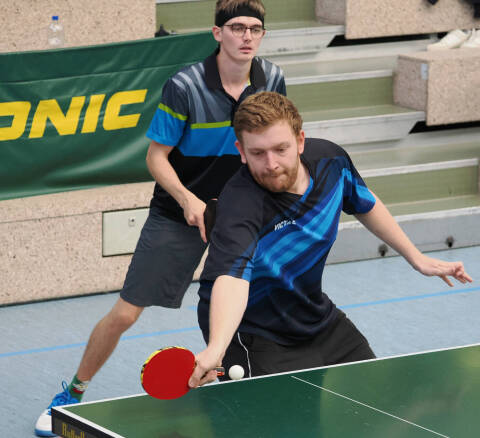 Auch Moritz Schmid war bei den Herren B etwas vom Pech verfolgt, denn er gewann ein Spiel mit 3:0, schied aber nach zwei 10:12-Niederlagen im Entscheidungssatz dennoch in der Gruppenphase aus. Serge Hillebrand spielte wie schon häufig in den letzten Wochen stark auf und wurde im Einzel nach knapper 2:3-Finalniederlage Zweiter. Im Doppel spielten er und Moritz groß auf und holten sich verdientermaßen den Bezirksmeistertitel.