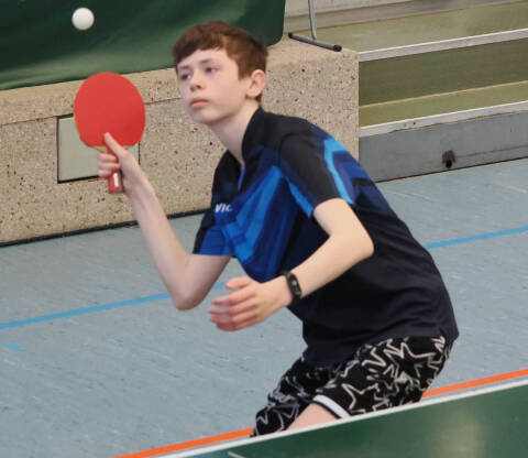 In der mit knapp 50 Teilnehmern unfassbar breit besetzten U19 spielten Jona Frank, Jonas Heyer, Ben Kemmler, Nicholas Krause, Noyan Müller-Sommer und Lasse Roewer um die begehrten Endranglistenplätze. Jona folgte weiter seinem Aufwärtstrend dieser Saison, besiegte viele Spieler, die stärker als er eintaxiert waren und holte sich einen sehr guten vierten Platz in seiner Gruppe. Jonas sammelte weitere Turniererfahrung und konnte eines seiner Einzel gewinnen, zeigt aber deutliche Fortschritte. Ben gewann alle Gruppenspiele und rang dabei auch den Favoriten Robin Kiesler mit 11:9 im fünften Satz in die Knie. 8:0 Punkte und die souveräne Qualifikation zeigen, dass Bens Trainingseifer sich mehr als auszahlt und er unser Jugendspieler der Stunde ist! Nicholas erwischte genau wie Jona einen guten Tag und duplizierte dessen Ergebnis. 5:3 Siege und Gruppenrang 4 gegen starke Konkurrenz sind aller Ehren wert. Noyan besiegte in seiner Gruppe alle Gegner, die schwächer als er eingestuft waren und kam mit ausgeglichener Bilanz von 4:4 auf Platz 5 in seiner Gruppe. Ein absolutes Kuriosum gab es für den stark aufspielenden Lasse, denn er war mit 5:2 Siegen hinter dem Erstplatzierten seiner Gruppe punktgleich mit zwei und satzgleich mit einem weiteren Spieler. Die eingegebenen Bälle ergaben, dass Lasse wegen eines einzigen gespielten Punktes die Nase vorn hatte und sich als Zweiter für die Endrangliste qualifizierte. Das Glück ist mit dem Tüchtigen!