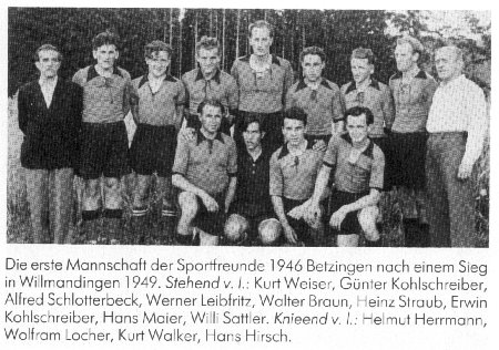 1946 Sportverein Betzingen Neues Leben auf den Sportplätzen Nach Kriegsende war das Clubhaus des Turnvereins durch Artilleriebeschuss der französischen Armee beim Einmarsch schwer beschädigt, Sportplätze verwüstet und das Turnen durch Anordnung der Siegermächte verboten. Erst im Jahre 1946 regte sich neues Leben auf den Sportplätzen. Karl Braun, Inhaber einer Kistenfabrik in Betzingen, hatte einen weiteren Sportverein in Betzingen gegründet, "die Sportfreunde 1946 Betzingen".